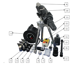 主機(jī)箱(A) 1個 配件箱(B) 1個 主機(jī) 1臺 三腳架 1個 水壺 1個 線盤 1個 起爆器 1個 電發(fā)火彈 10個 彈筒 1個 鏟形切刀彈 3個 錐形有機(jī)玻璃彈 3個 圓柱形鋼芯彈 3個 圓錐形鋼芯彈 3個 棘輪扳手 1個 退彈桿 1個 水堵 10個 連接短線 1根 合格證 1個 說明書 1份