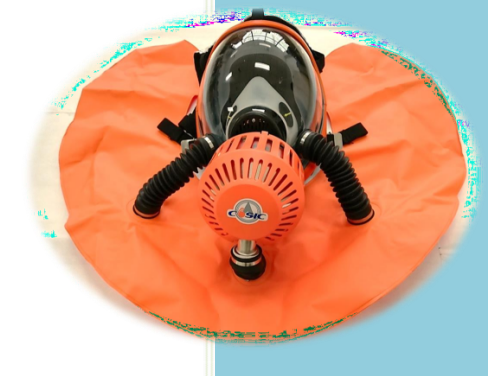 遇到緊急情況或者需要隔絕式防護的應急場合,使用人員應按佩戴的要求迅速戴上呼吸面罩,并根據個人臉型調整呼吸面罩上的緊固帶松緊程度,并佩戴緊固。人員呼出的低氧氣含量17%左右、高二氧化碳含量4.5%左右的氣體通過呼吸面罩的單向出氣口進入空氣再生罐。在空氣再生罐內,呼出氣體中的二氧化碳與生氧劑發生化學反應產生氧氣。當呼出氣體從空氣再生罐經呼吸軟管流入氣囊時已置換成新鮮空氣。新鮮空氣儲存在氣囊中,人體吸氣時產生負壓,新鮮空氣分別沿氣囊左右兩側的呼吸軟管流回面罩內,完成一次空氣循環再生;并依次往復循環下去,連續不斷地提供人體呼吸所需的新鮮空氣。