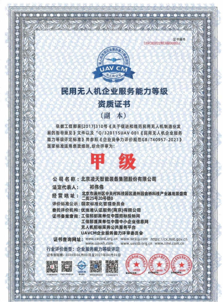 資格類民用無人機企業服務能力等級資質證書(甲級)