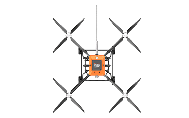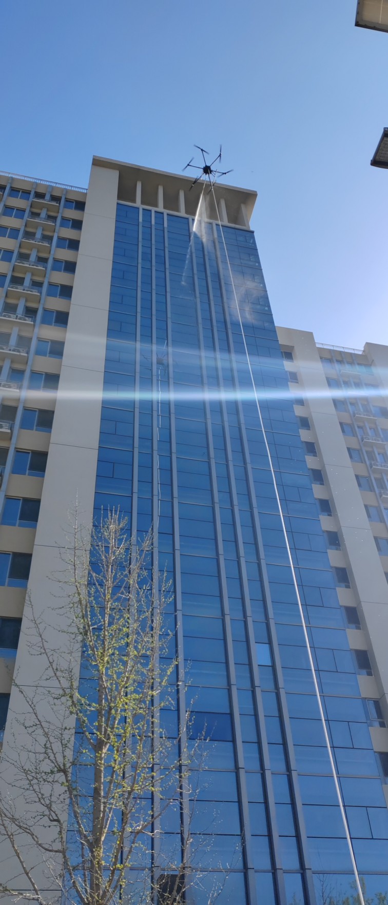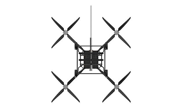 該無人機可裝載在消防車上,能快速啟動升空,通過特制高壓水帶與消防車水罐連接,消防車水罐內部高效泡沫/水基滅火劑輸送到無人機平臺,在水槍噴口水平噴射出去,達到滅火的效果。