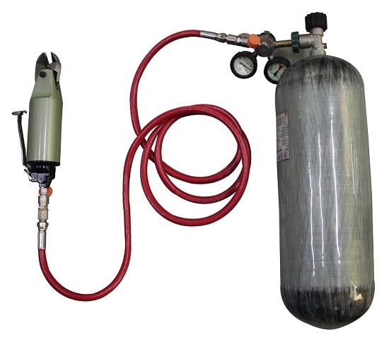 礦井錨護網(wǎng)的拆除比較復(fù)雜繁瑣,常規(guī)的辦法采用手動鋼筋鉗,存在勞動量大、效率低等諸多問題,QSD-4.5礦用氣動剪斷裝置(氣動鐵絲速斷器)是一款能連續(xù)快速剪切鐵絲的設(shè)備,采用氣動原理,由井下壓風(fēng)管道提供動力,切割范圍:鐵絲、鋼絲、錨護網(wǎng);最大剪斷直徑: