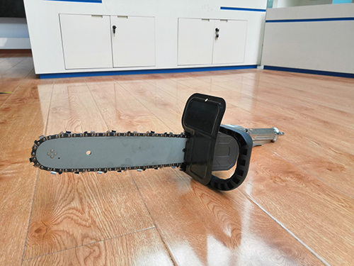 PJQL-4 礦用氣動鋸(以下簡稱氣動鋸),是我公司經過多年的探索,在機電、通風、采煤等各科室的高技術素質科技人員的通力合作下,為煤礦開發出的礦用切割與開槽工具。氣動鋸由鋸頭、鏈條、聚氨酯軟管三大部分組成,聚氨酯軟管將氣源和氣動鋸連接起來,氣源提供的氣壓驅動氣動鋸高速運轉,進行切割。工作時,冷卻水通過導板中間的孔流向切割部位,起到冷卻和降塵的作用。并且具備雙重斷水保護功能,氣動鋸在切割時采取了濕法切割水冷卻,以避免切割時出現火花??捎糜诓删蚬ぷ髅媸褂玫拿簩?、巖石切割,用于密閉墻的砌筑,也可用于礦山救援時的混凝土與巖石破拆。