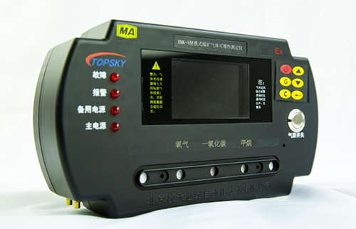 BMK-A便攜式煤礦氣體可爆性測定儀(以下簡稱測爆儀),是用于煤礦井下使用的礦用本安兼隔爆型攜帶式儀器。測爆儀用于煤礦井下,由礦山救護隊員攜帶進入災區,監視作業環境周圍氣體組份是否存在爆炸危險。也可由消火人員攜帶,在處理自然發火或啟封火區過程中,檢測周圍環境或密閉內空氣中甲烷、氧的濃度值,在儀器液晶顯示屏上直接顯示出O2、CH4、CO的濃度值和環境溫度值,并顯示出“爆炸三角形”的圖形及各氣體組份所構成的坐標點,臨近或達到警界限時儀器同時發出聲、光警報。