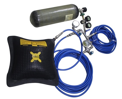 高壓氣瓶通過壓力調(diào)節(jié)器(減壓閥)的減壓,將25MPa的高壓空氣降低到0.8MPa低壓空氣,0.8MPa低壓空氣通過雙向控制器連接兩個氣墊或兩個氣囊,可完成兩組起重操作。控制器由雙向控制器和單向控制器兩種類型,顧名思義,雙向控制器可連接兩個氣墊或兩個氣囊,單向控制器可連接1個氣墊或1個氣囊。氣囊與氣墊的區(qū)別為,氣囊起重力小,起重高度高,氣墊剛好相反。