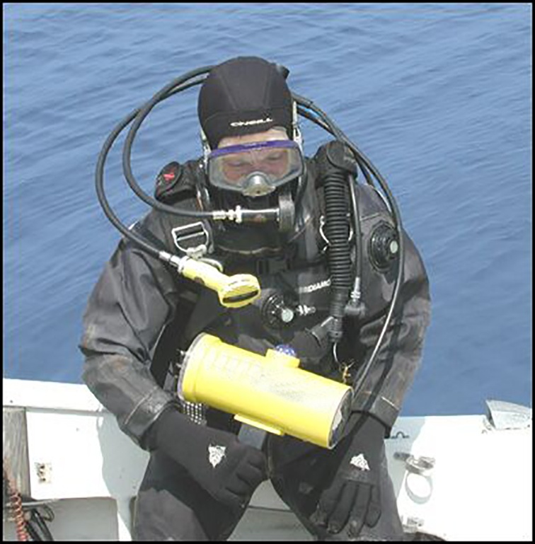 持聲納設備為便攜式、組合式的聲納系統,由聲吶發射器和聲吶接收器兩部分組成,可實現發射和接收的操作。聲吶發射器可為潛水員在水下定位水下物體。頂部帶有指南針,方便在水下辨別方向, 整體為醒目的亮黃色,接收器帶有槍式握把,潛水員可單手操作接收器。