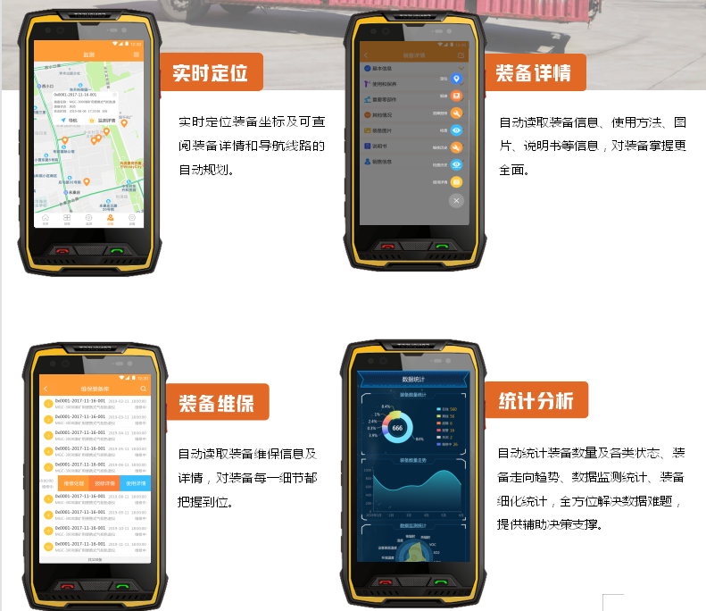 應急消防裝備云管理平臺系統(tǒng)能夠直接通過職能人員手持的防爆終端,直接讀取系統(tǒng)內所有的裝備、設備及具體的詳情、圖片、位置、傳輸的數據,根據裝備具有特性進行實時在線監(jiān)測,當監(jiān)測到的數據超標時,實時進行報警及查閱報警信息。該平臺系統(tǒng)能夠結合智能防爆終端本身功能、北斗定位/GPS定位、錄像、拍照等進行信息存儲,隨時隨地查閱裝備庫、維修庫、報廢庫等級占比利用率分析,最終進行數據統(tǒng)計分析處理。此外該系統(tǒng)支持本地化業(yè)務拓展,如:現(xiàn)場監(jiān)控、無線打印,保障此平臺系統(tǒng)在不同環(huán)境中的應用與融合。