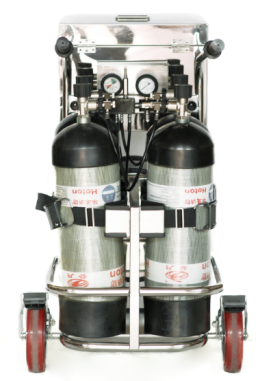 移動供氣源適用于在化工廠內(nèi)污染地區(qū)進(jìn)行長時間的維修工作,或在缺氧地區(qū)工作。最大可在直徑為50 m的范圍內(nèi)工作,也可進(jìn)入狹窄的空間作業(yè)。該裝置不可在水下使用。持續(xù)供氧時間取決于使用者的氣量儲備。